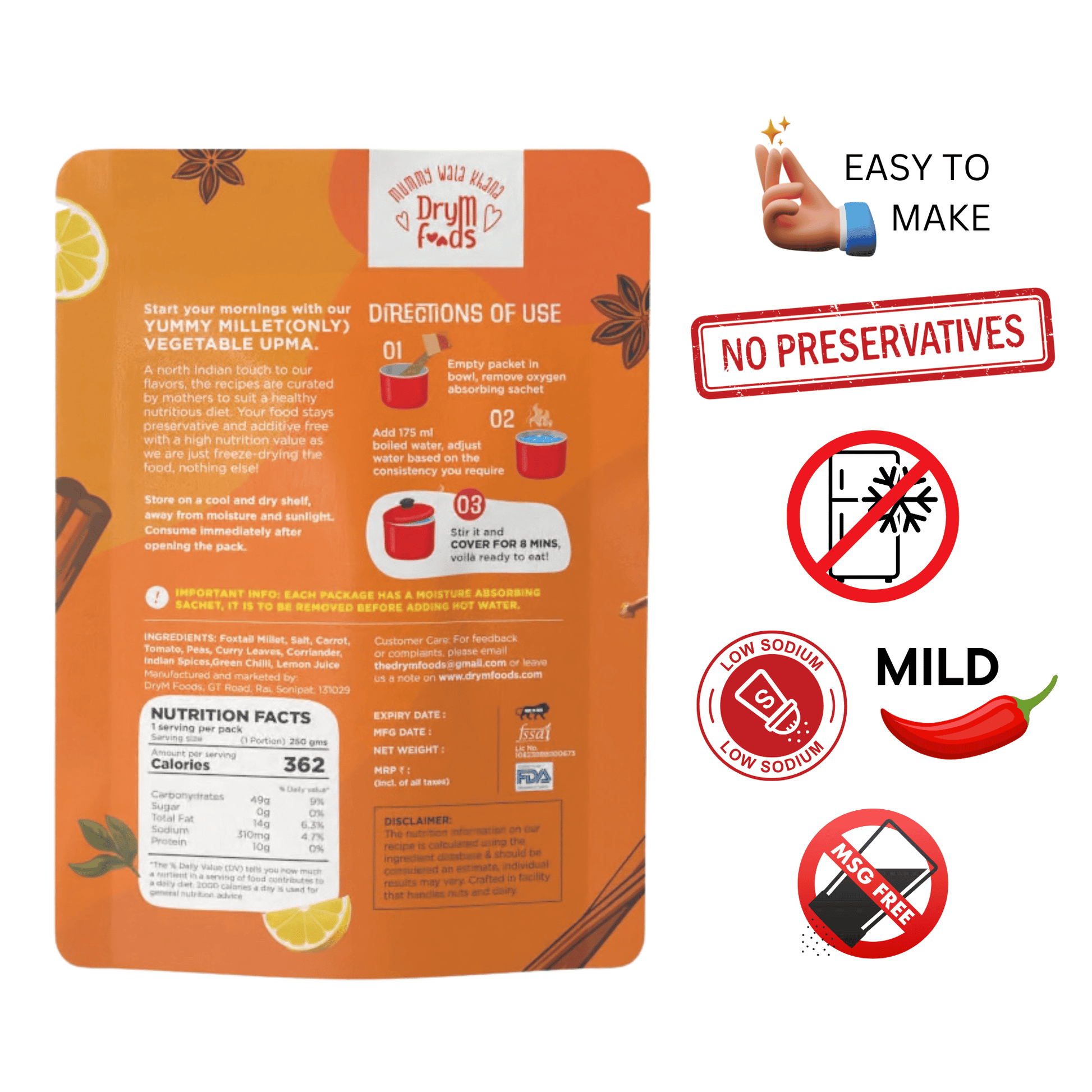INGREDIENTS: Foxtail Millet, Mustard seeds, Urad dal (split black lentils), Chana dal (split Bengal gram), Onions, Carrots, Peas, Curry leaves, Ginger, Salt, Lemon juice