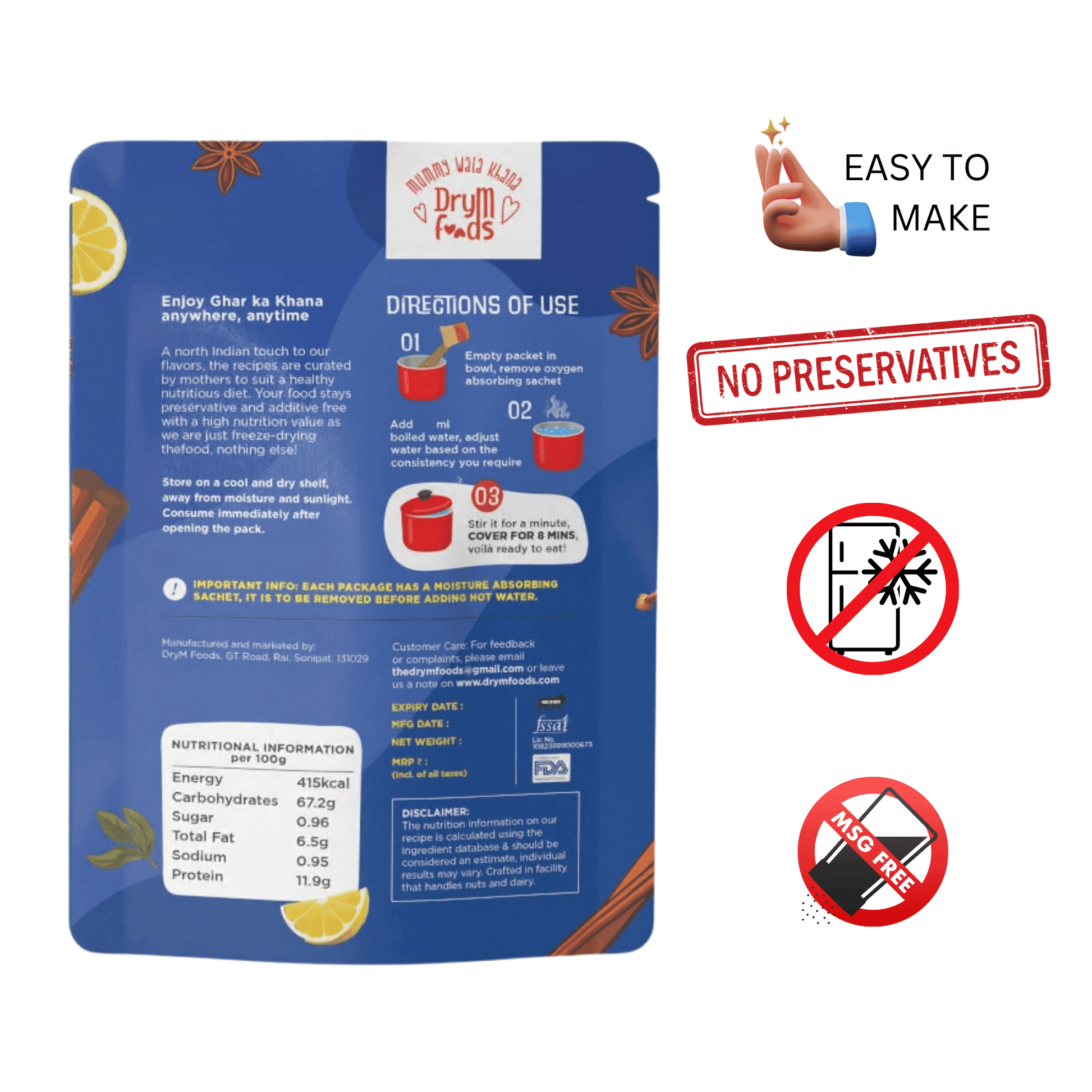 How it all works: Short answer, Freeze Drying! Long answer, fully cooked food is first spread evenly on sterilized stainless steel trays, then the food is taken to -35 deg C. Post this step, in a vaccum chamber, with slow heating upto 55 deg C, the food is dried ensuring low nutritional loss and the magic of Indian flavors stay intact in our yummy mummy wala khana!