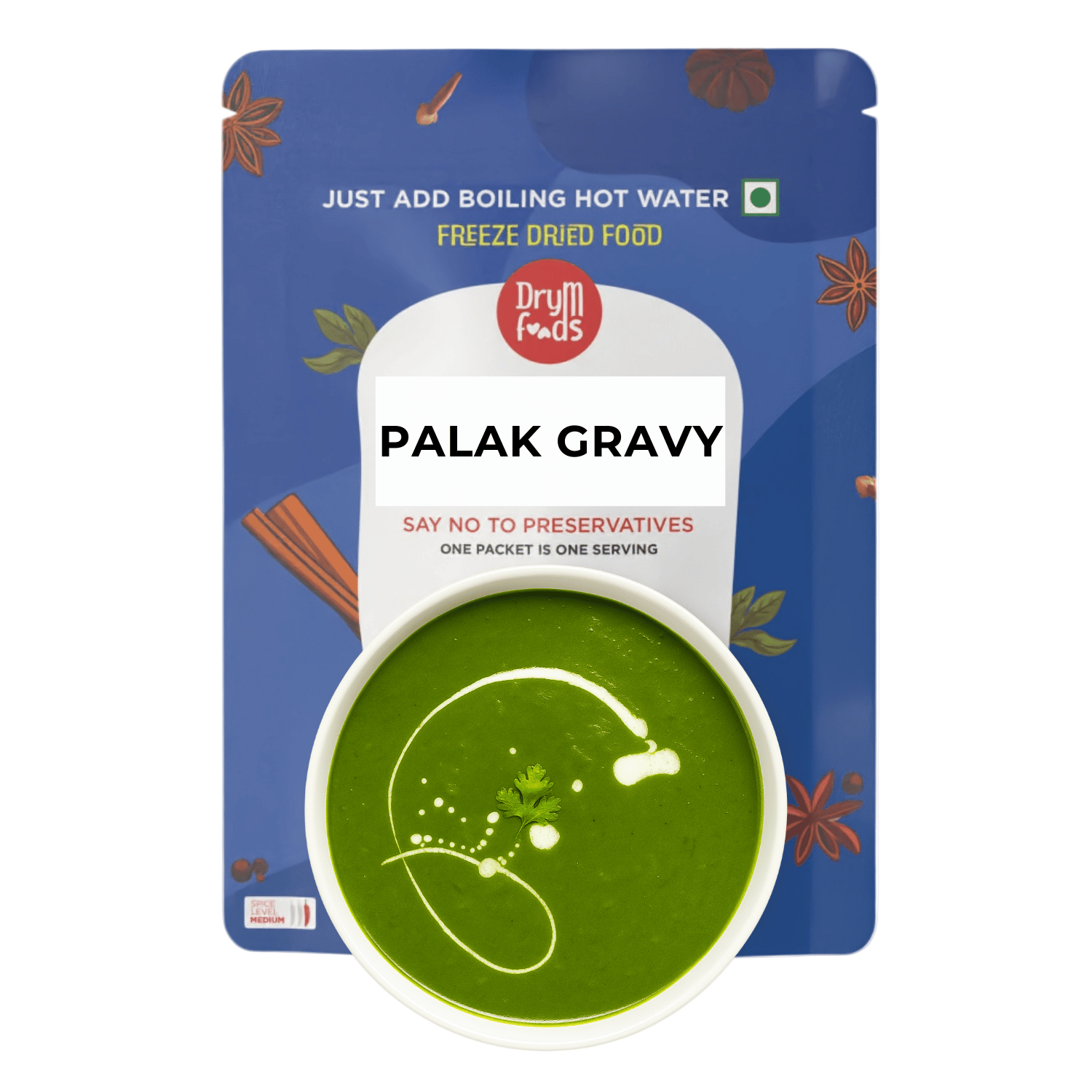 Our Palak Gravy (Spinach Curry Base) is rich in iron, vitamins, and antioxidants, making it a powerhouse of nutrition in every bite. Fresh spinach is cooked with mild spices and freeze-dried to preserve its natural green color, taste, and goodness. Low in calories yet high in fiber, this preservative-free gravy is a wholesome way to enjoy healthy ghar ka khana, ready in just minutes.