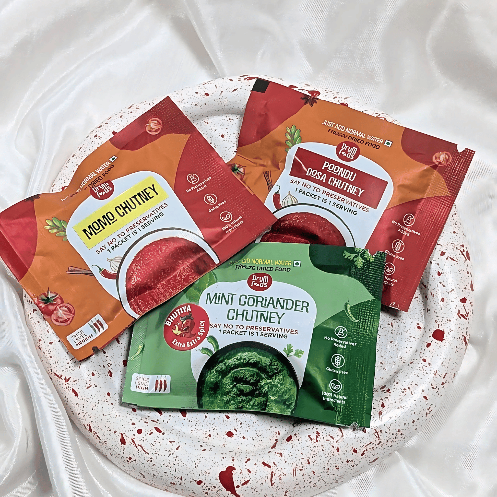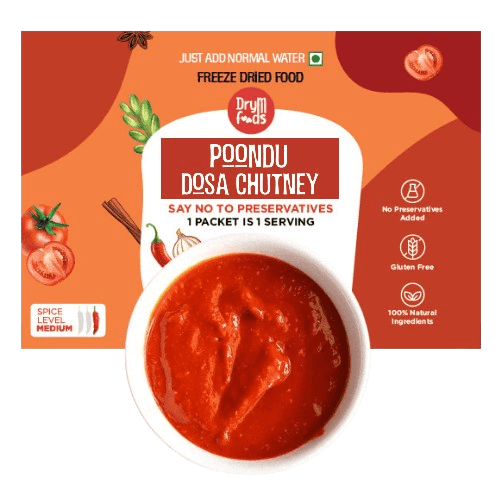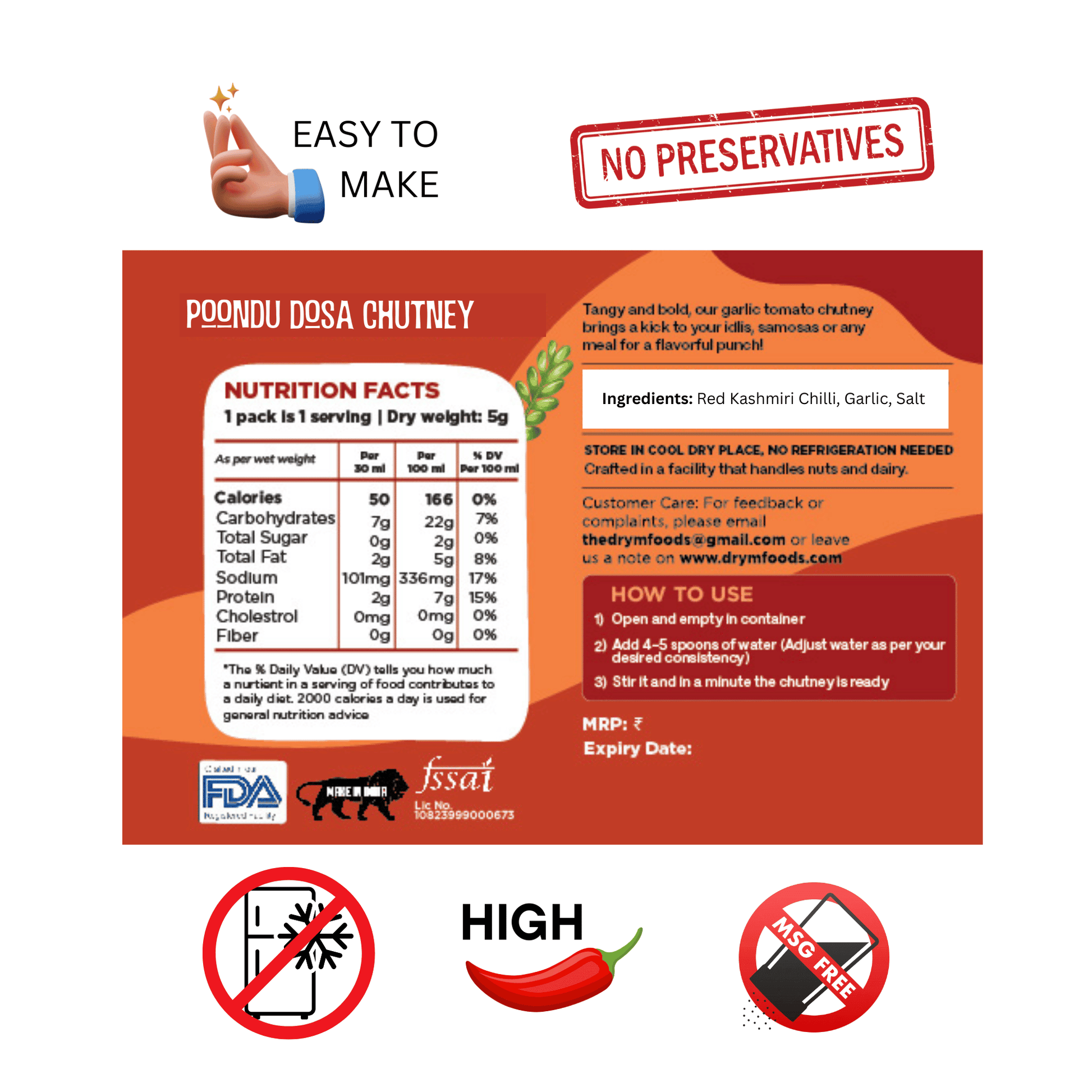 Bring the bold flavors of Tamil Nadu to your plate with our Poondu Dosa Chutney — a traditional South Indian garlic chilli chutney in the DryM style, made to pair perfectly with dosa, idli, uttapam, or rice. Freeze-dried for freshness, this chutney is rich, fiery, and full of roasted garlic punch.