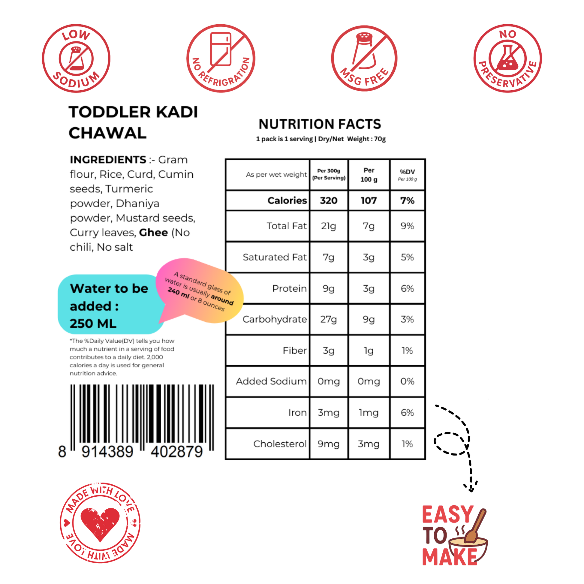 INGREDIENTS :- Gram flour, Rice, Curd , Indian Spices, (No Chili, No Salt)